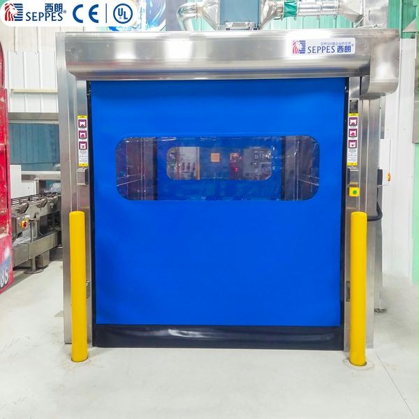 食品工廠刷洗間設計的快速卷簾門,采用拉鏈結構密封+PVC高韌門簾+304不...